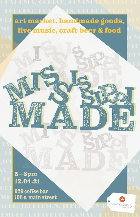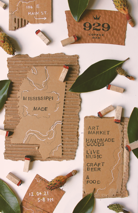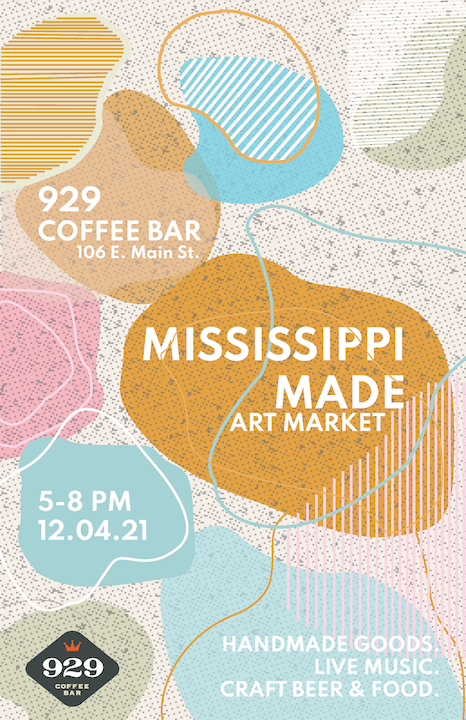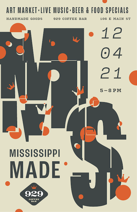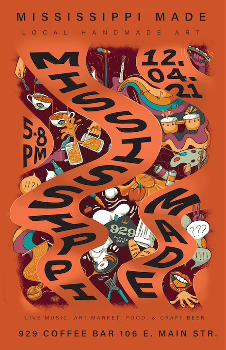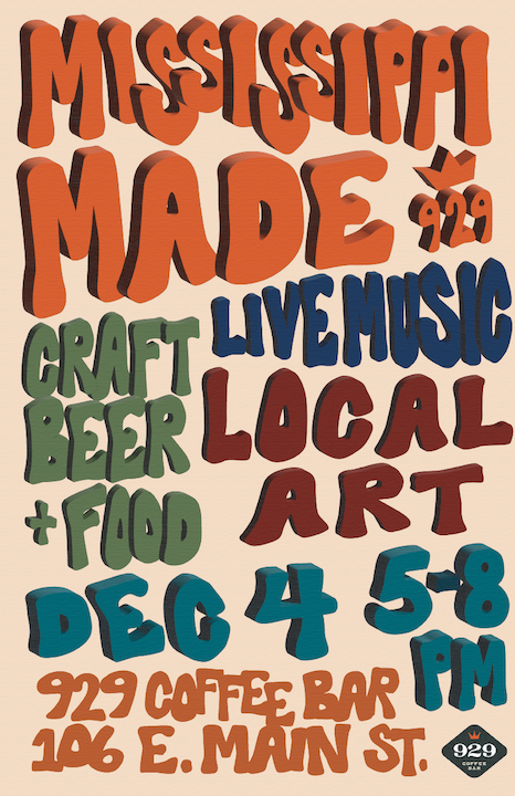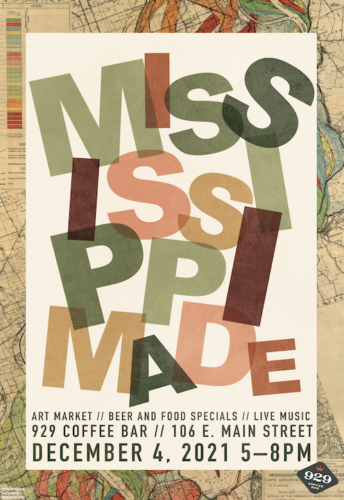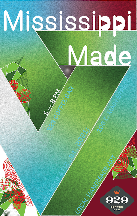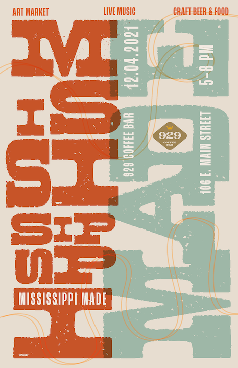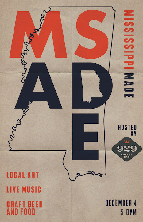 The goal of this project is to design a key visual for the 929 Coffee Bar event Mississippi Made, an art market, live music, and beer and food specials event. The even brings together creatives from all over the state of Mississippi to share, sell, and exhange their work, ideas, music, and more. The focus on a key visual versus a poster design is very intentional, as promotional design has evolved beyond the contraints of a poster, and now must provide a flexible and scalable visual for printed as well as ditial formats.