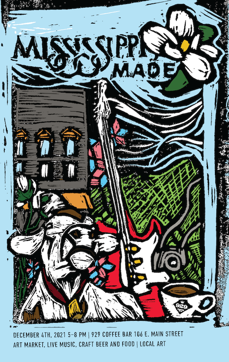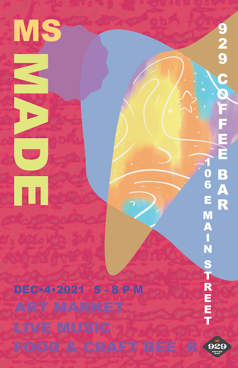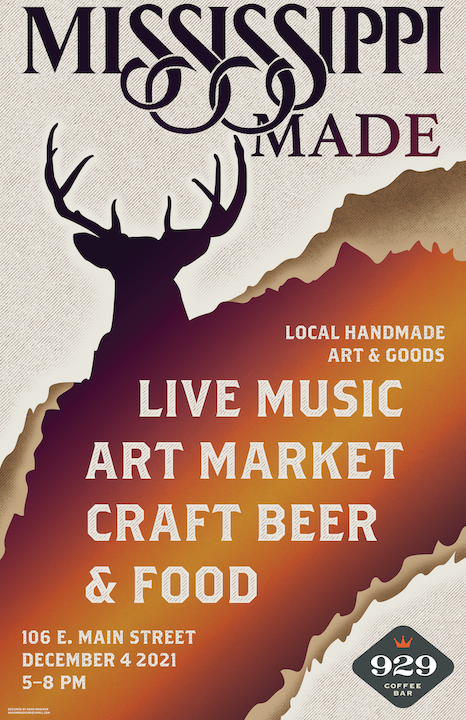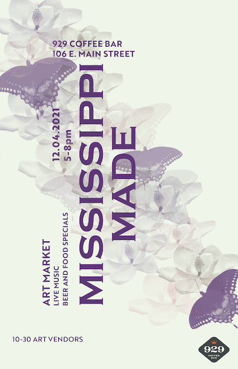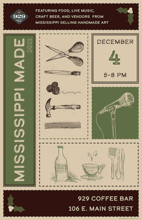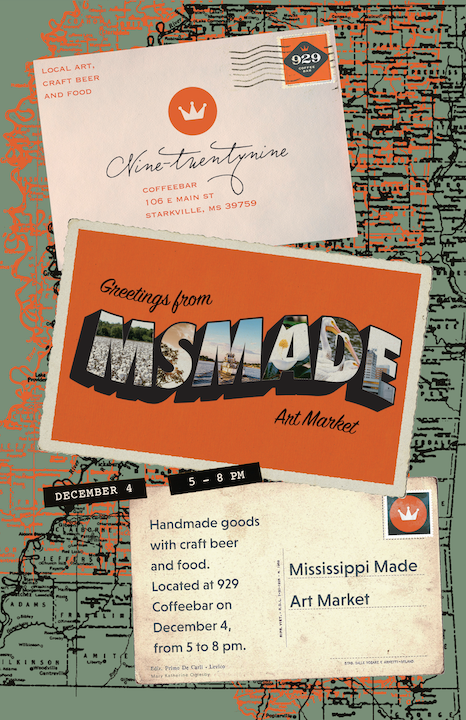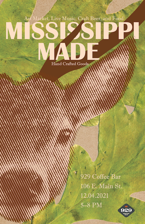 The goal of this project is to design a key visual for the 929 Coffee Bar event Mississippi Made, an art market, live music, and beer and food specials event. The even brings together creatives from all over the state of Mississippi to share, sell, and exhange their work, ideas, music, and more. The focus on a key visual versus a poster design is very intentional, as promotional design has evolved beyond the contraints of a poster, and now must provide a flexible and scalable visual for printed as well as ditial formats.