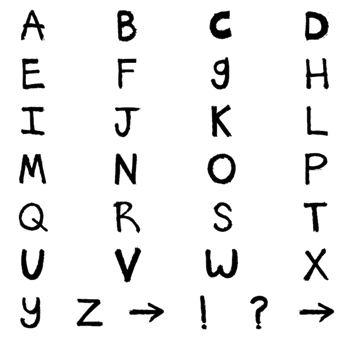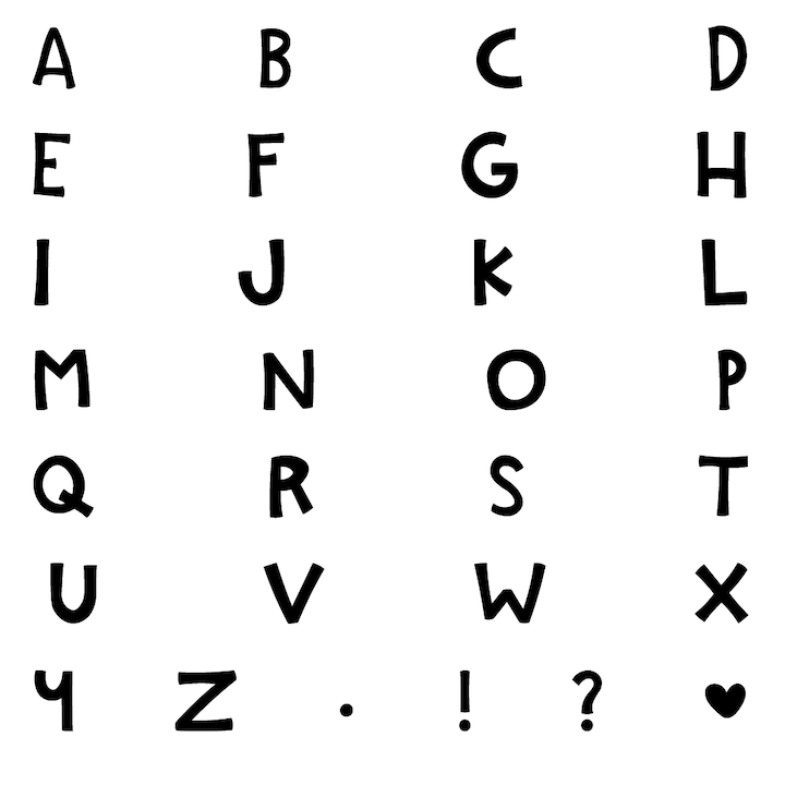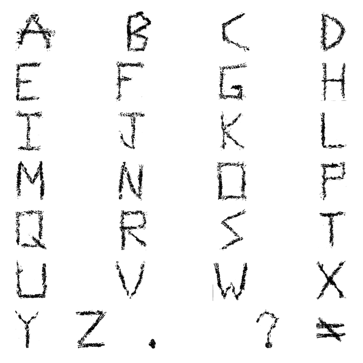 ABCDEFGHIJKLMNOPQRSTUVWXYZ.!? (and 1 wild card)