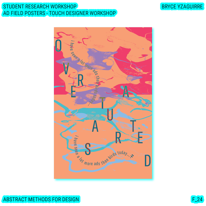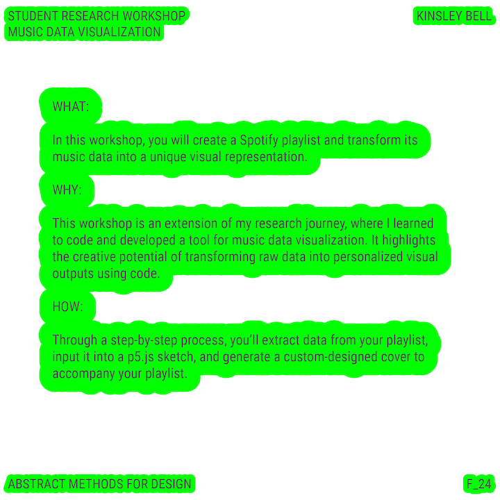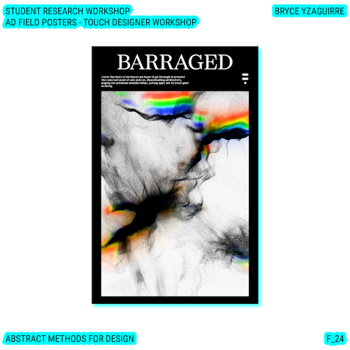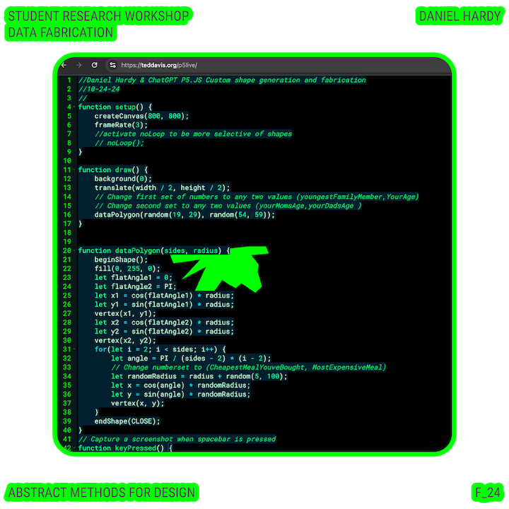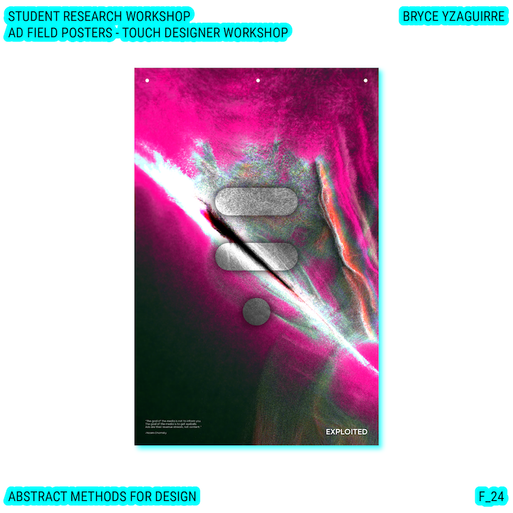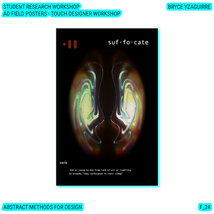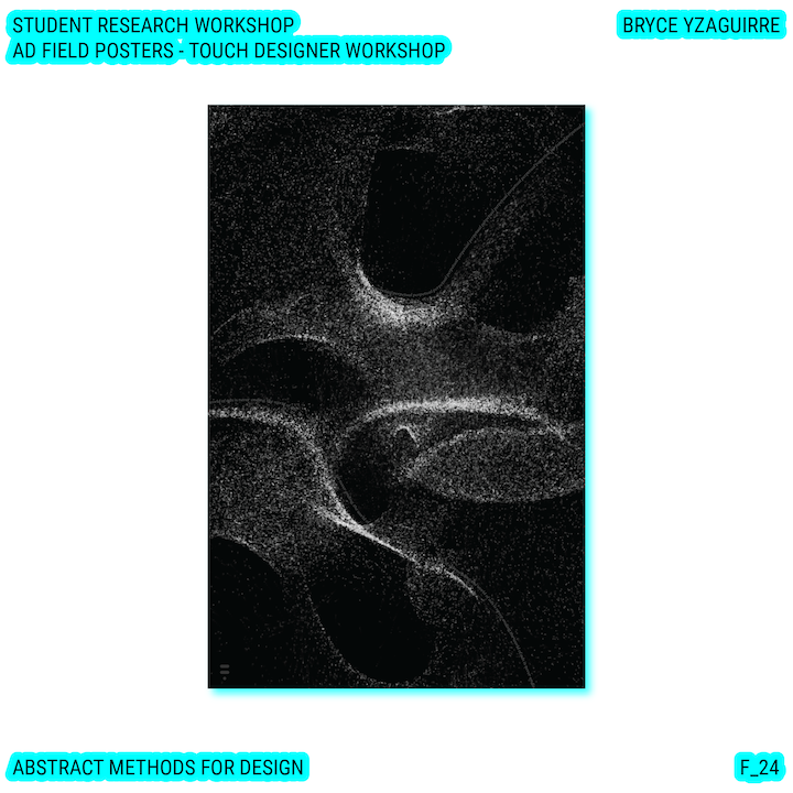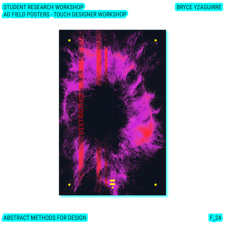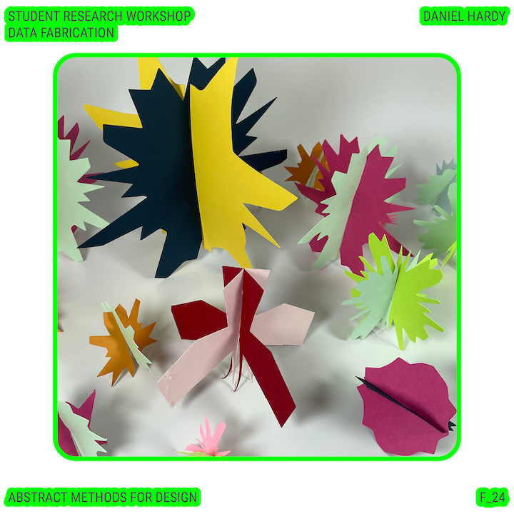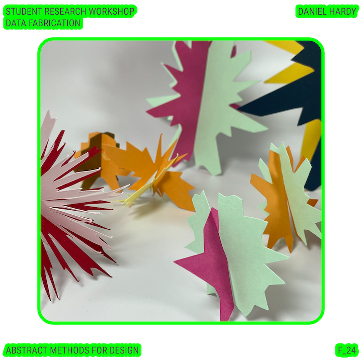 Throughout this course, each student will conduct research, identify a data-driven narrative, collect data, implement and manipulate data, and through abstract methods of tool and material experimentation (primarily creative coding), produce a research output that communicates a narrative through the lens of data-informed (abstracted) design.