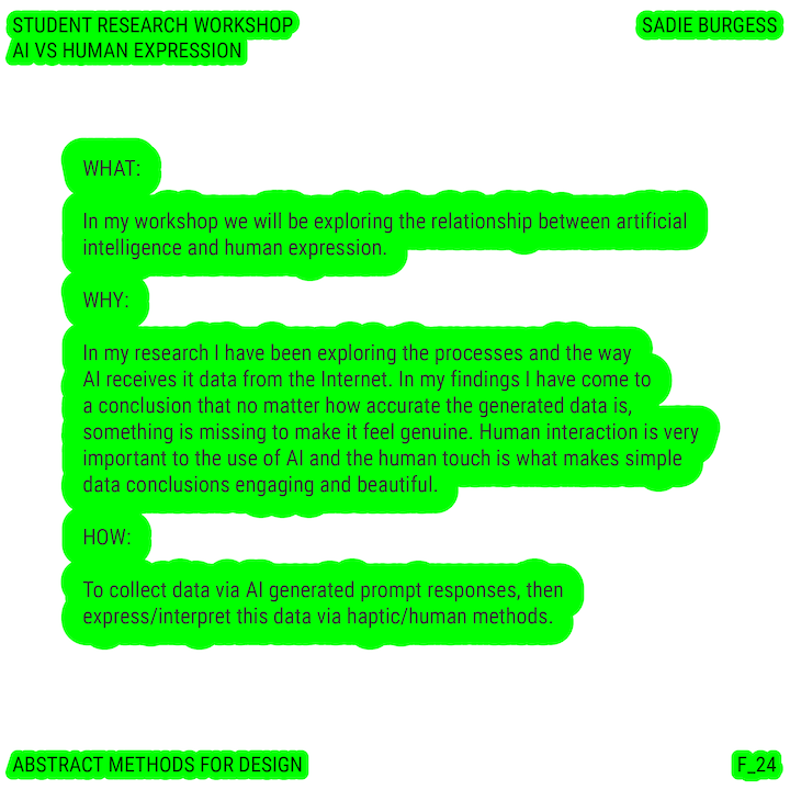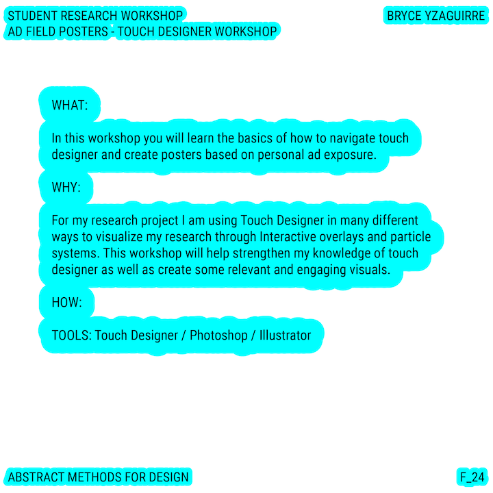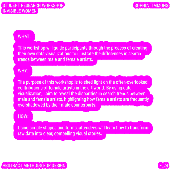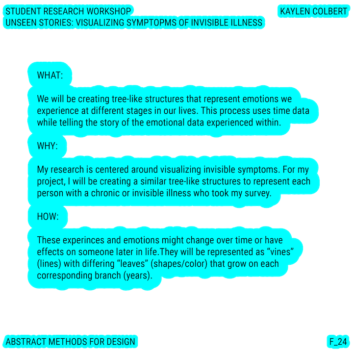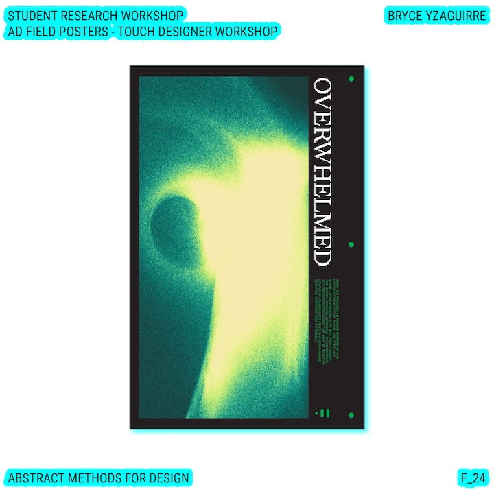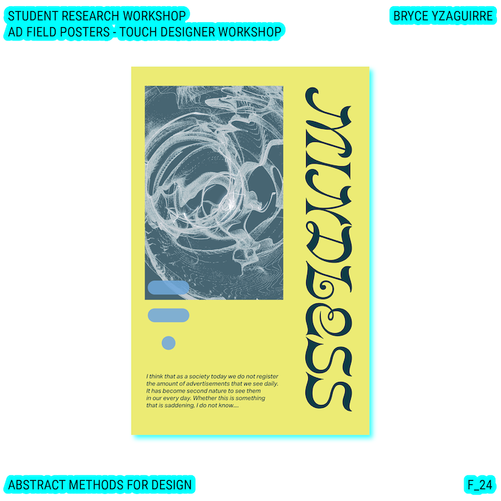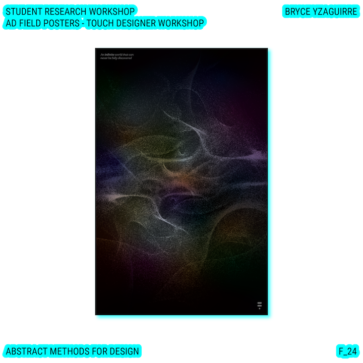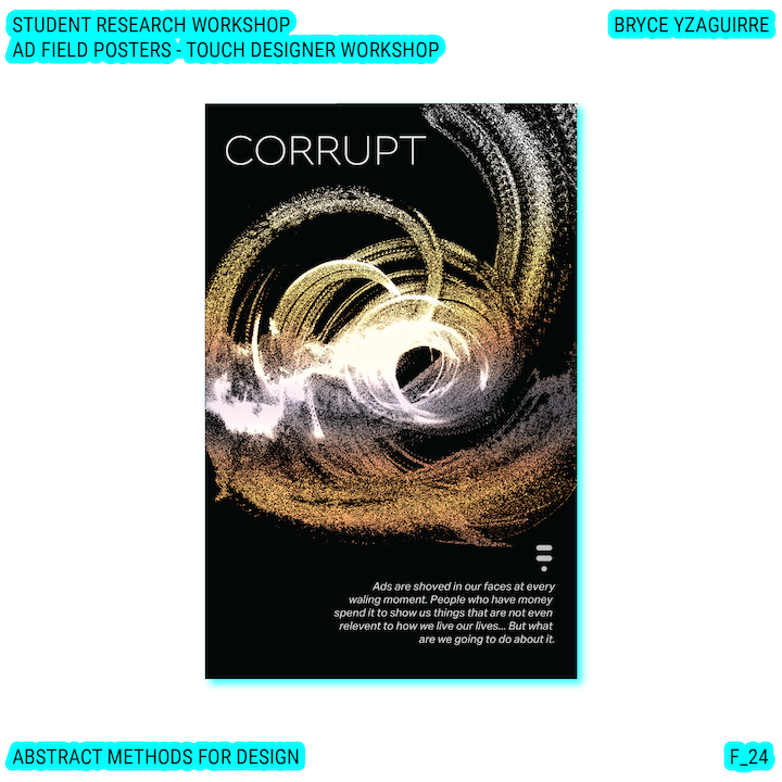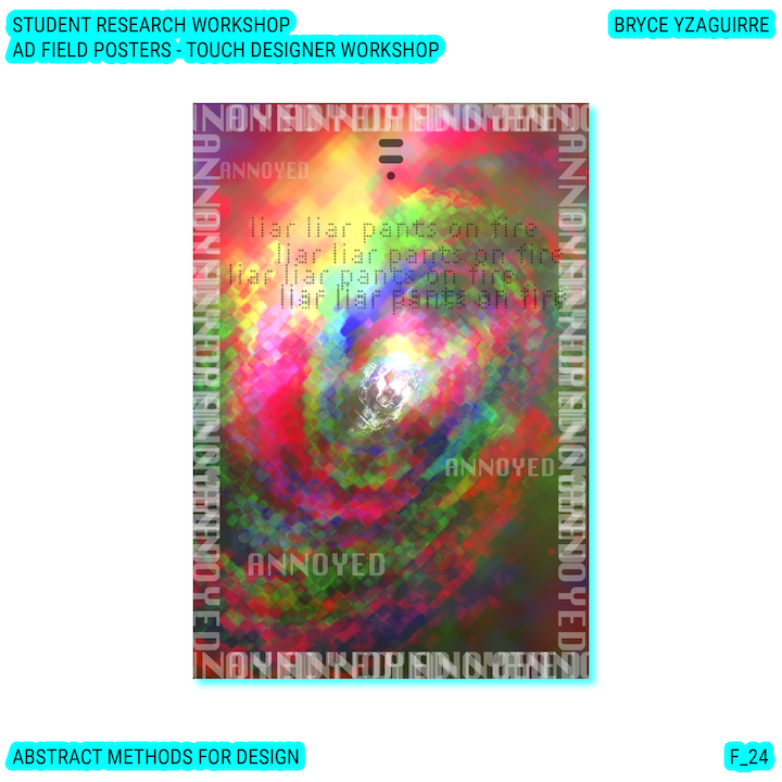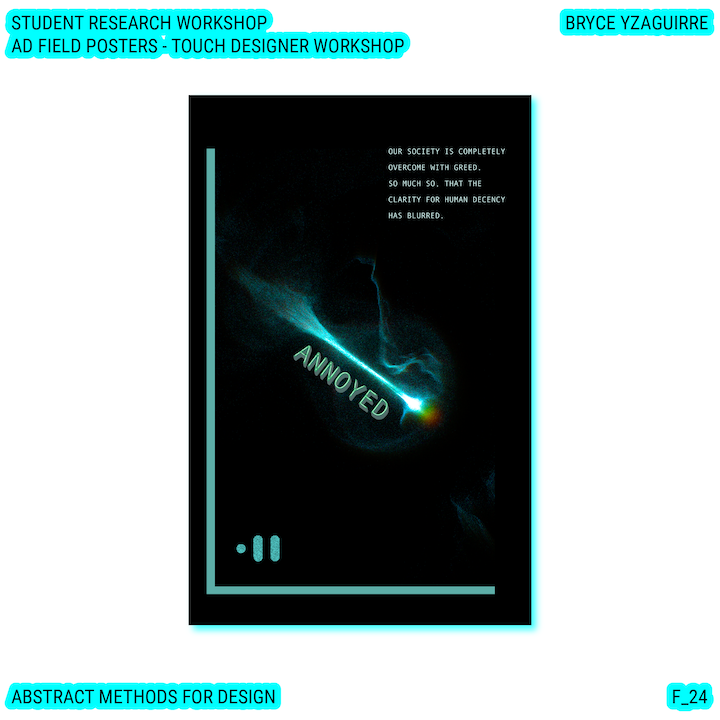 Throughout this course, each student will conduct research, identify a data-driven narrative, collect data, implement and manipulate data, and through abstract methods of tool and material experimentation (primarily creative coding), produce a research output that communicates a narrative through the lens of data-informed (abstracted) design.