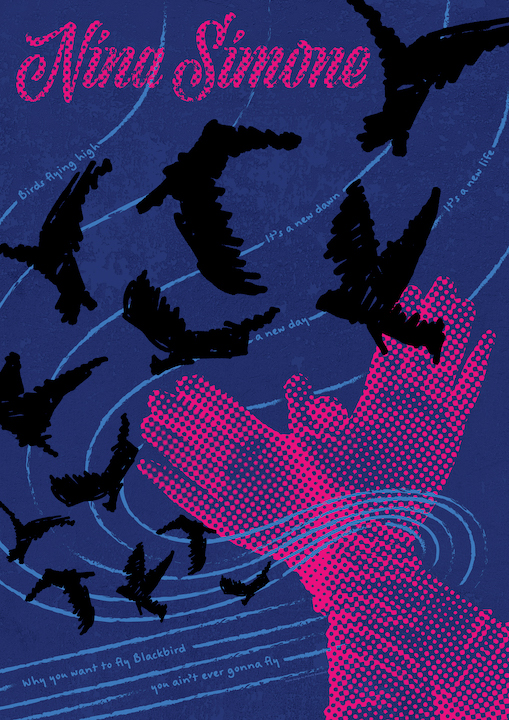 Nina Simone was a singer, songwriter, pianist and civil rights activist that created urgent, emotional intensity by singing songs of love, protest, and black empowerment. Multiple of her songs reference birds and specifically the song “Blackbird” she sings about the struggle and pain of black women. In my poster I wanted to portray the tension between the birds’ desire to fly and how she created hope through her music. I included the straight lines of sheet music with lyrics from “Blackbird” to represent the initial failure of flight, but then the lines wrap around Nina Simone’s pink gloves, which also make a bird shape to also symbolize herself as a bird. From there, the lines then flow out and up with the birds taking flight and lyrics from “Feeling good” to represent how her words have an impact on the euphoric feeling that comes with liberation from oppression.