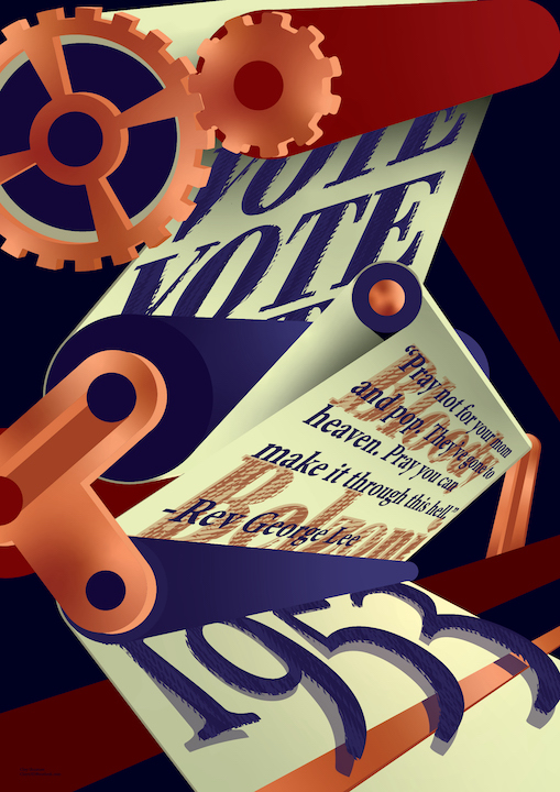I wanted to show what Skip James’s life was like in the most simple way possible. I wanted it to look rough because he did some rough bootleg jobs in his life. Even though he was on a rough path, I wanted to show that Skip was a musician at heart which is why I put his two instruments of choice in his name.