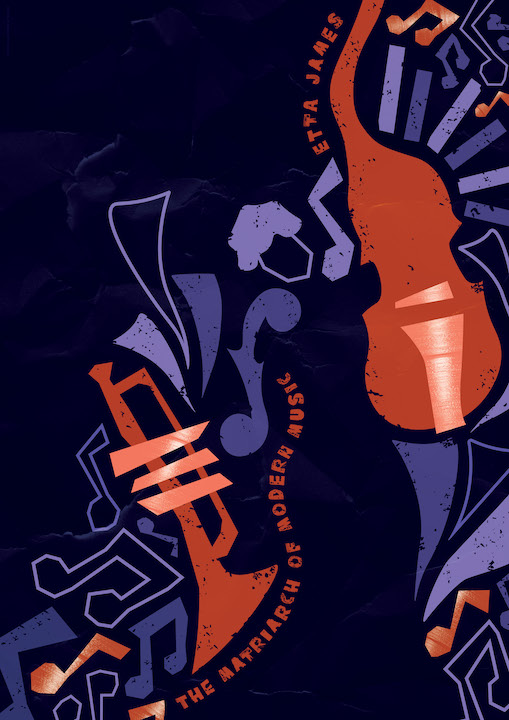 In her lifetime, Etta James played an important role in many genres of music: jazz, R&B, soul, rock ‘n roll, and arguably many more. However, James began her musical journey as a child singing gospel and blues. Using rich blue-purples and oranges, I wanted to display the “Matriarch of Modern Music” using graphic shapes and gritty textures that represent the sounds, instruments, and feelings that her music conveys. Together, these shapes imply an abstract form of the matriarch herself. I hope that this poster reveals the layers of influence that Etta James had in the music industry—an influence that she still has today.