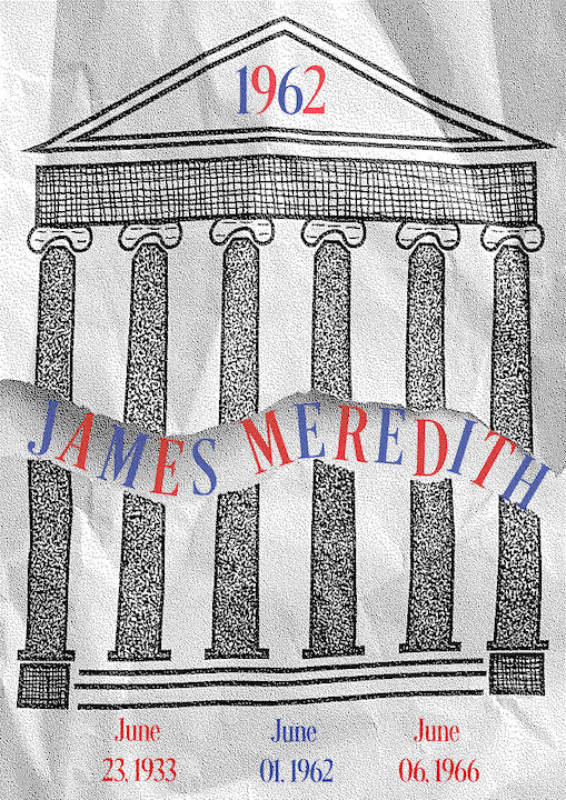 James Meredith was the first African American to end segregation at the university of MS (ole miss) as well as the USA. The rip with his name inside signifies that he did that. The texture and the crinkle of the paper is to resemble old news paper. The dates at the bottom are his birth date, the day this event occurred, and the fate of his civil rights March.